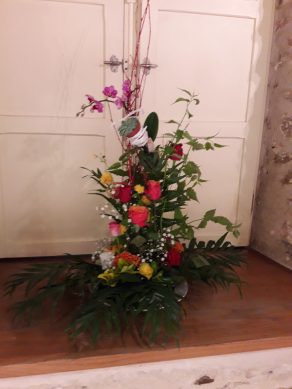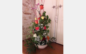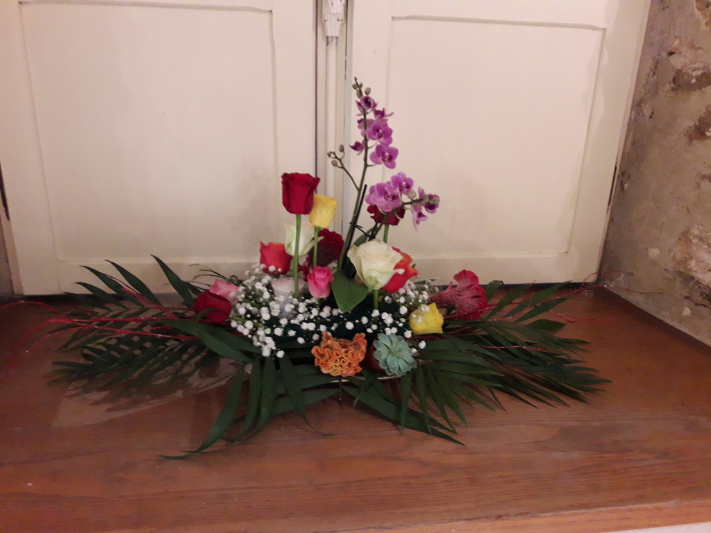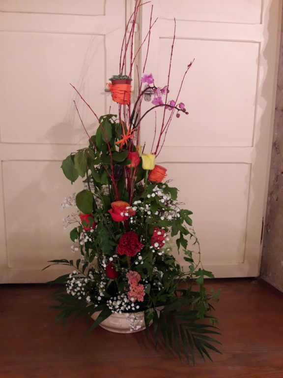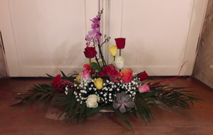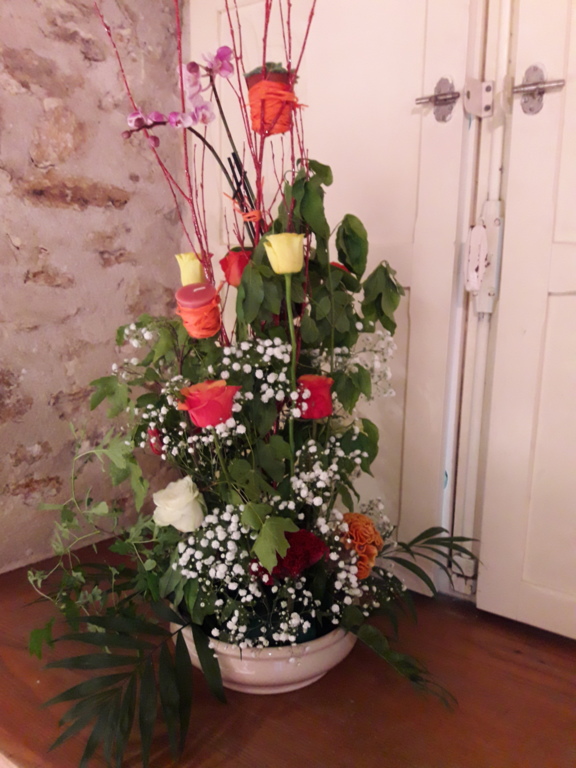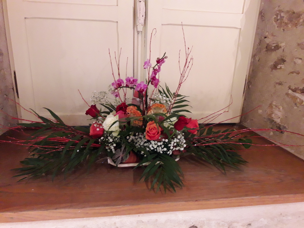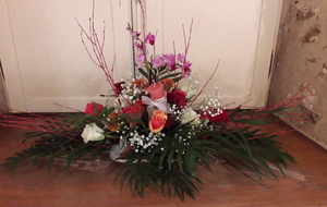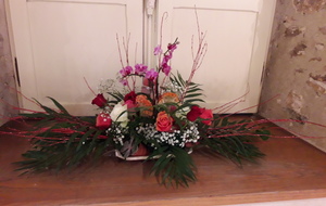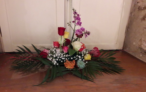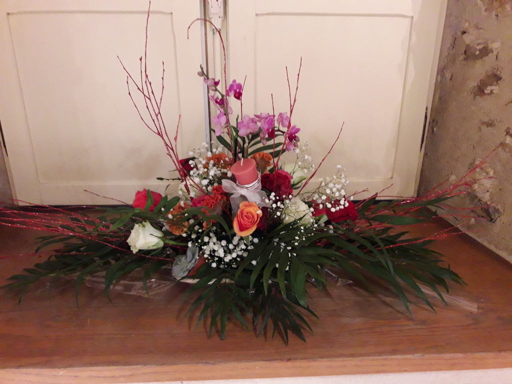 Pour réaliser le centre de table (ou de buffet) nous avons utilisé : des fleurs (1 orchidée, 1 crassulacée, des roses des crêtes de coq et du gypsophile) ; du branchage et du feuillage pour le volume, un plat et de la mousse florale pour le contenant. Certaines ont ajouté une bougie