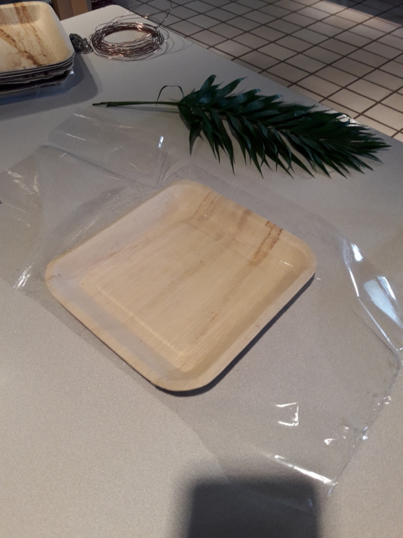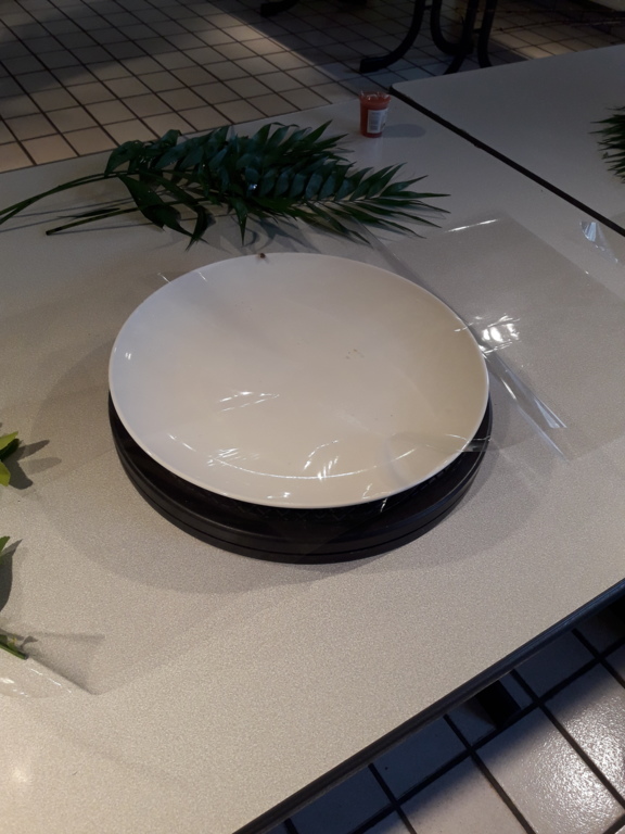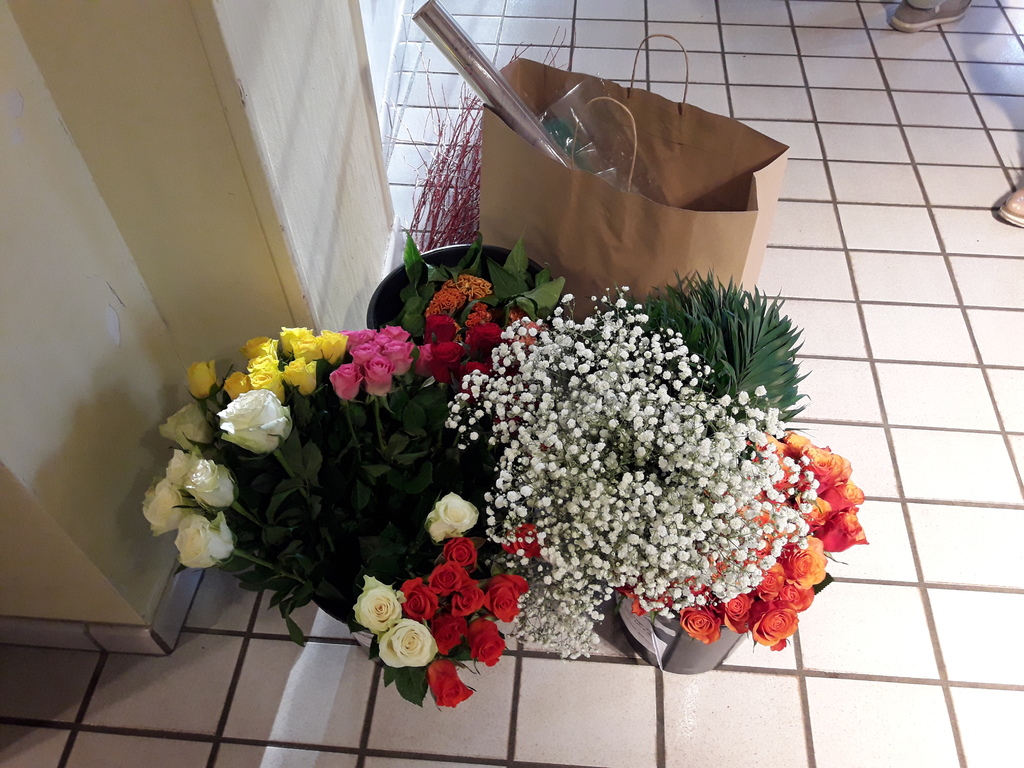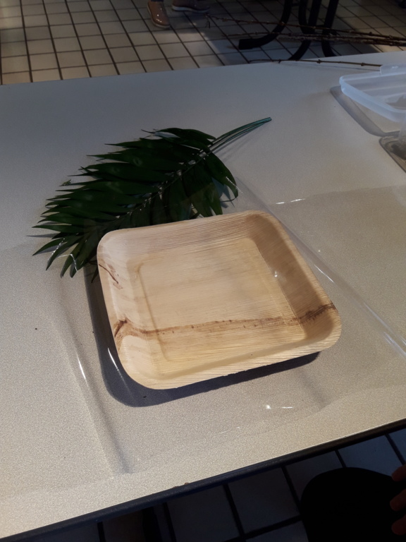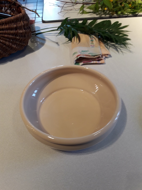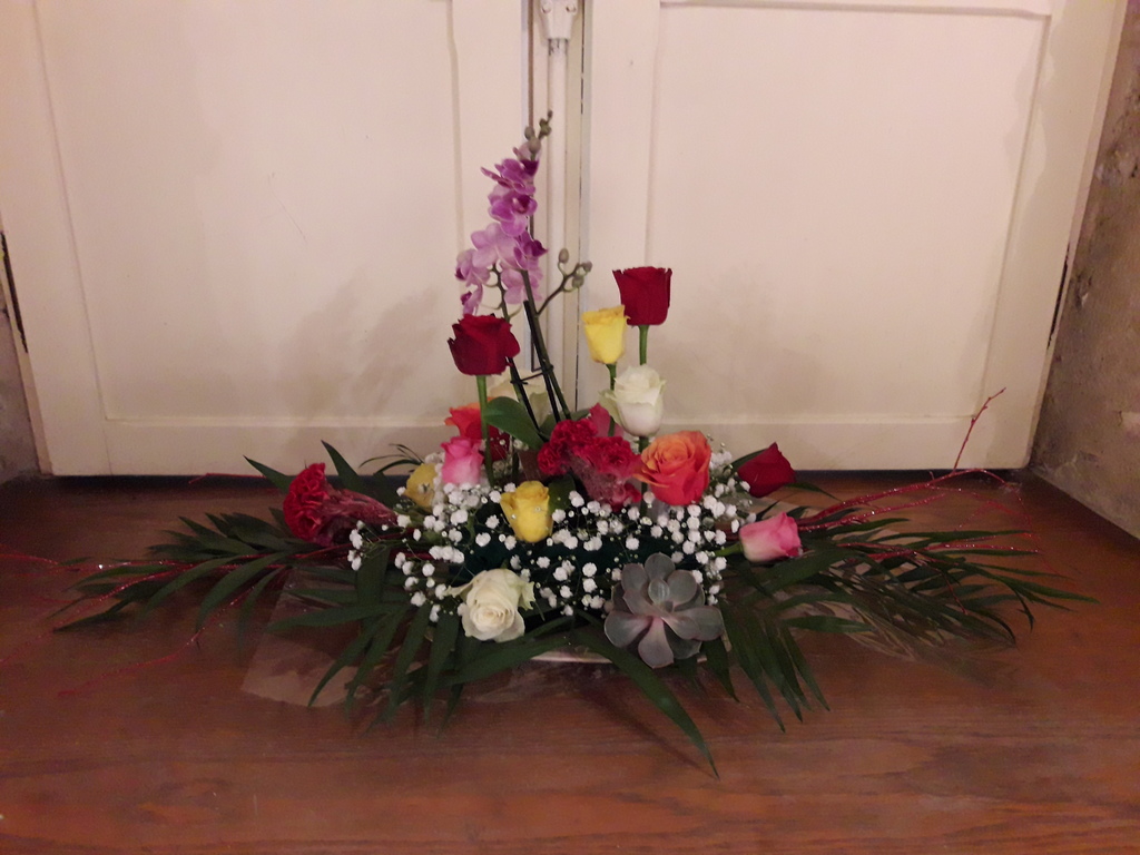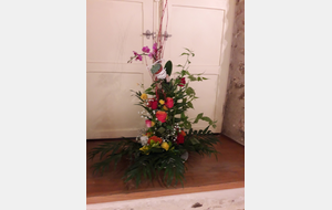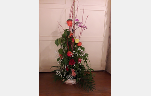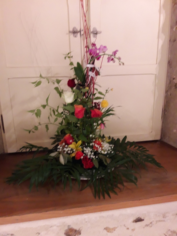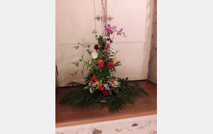 Pour réaliser le centre de table (ou de buffet) nous avons utilisé : des fleurs (1 orchidée, 1 crassulacée, des roses des crêtes de coq et du gypsophile) ; du branchage et du feuillage pour le volume, un plat et de la mousse florale pour le contenant. Certaines ont ajouté une bougie